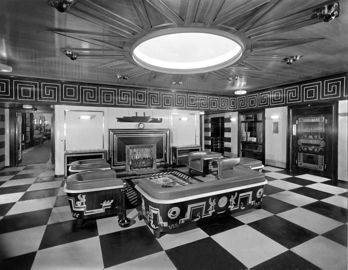 Entréhallen ger en dramatisk framtoning genom överdimensioneringen av golv rutmönster. I miten en dom, inramad av en mässingskrans, som också tjänade som fäste för ventileringen ombord. Den öppna spisten i fonden är en attrapp. Till vänster skymtar en av utgångarna mot sällskapsrummet, till höger en kiosk samt den rikt dekoreradde hissdörrarna. Möblemanget med sfinxer och ormar är grupperade runt en praktfull matta av sälskinn.