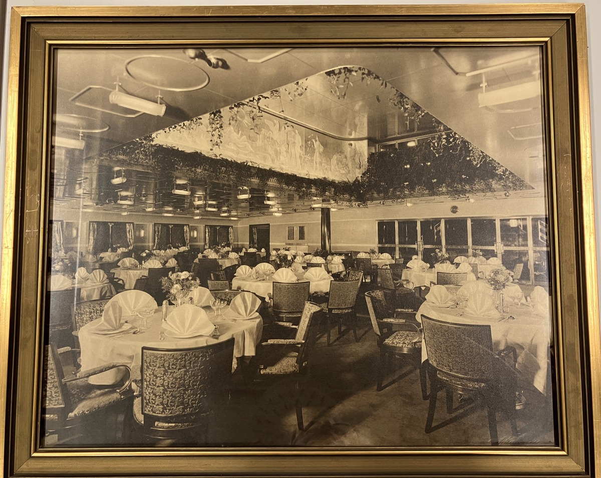 Första klassens matsal var möblerad av NK, med stolarna klädda med siden i rött från Bevilacqua & Figlio i Venedig. Det snövita bordslinnet var tillverkade vid Almedahls fabriker.
