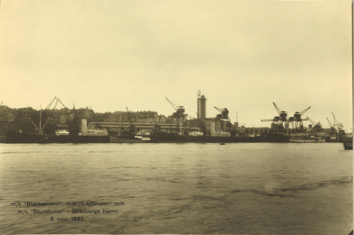 Fotografiet är taget 8 november 1932 och visar de tre fartygen BLANKAHOLM, LAGAHOLM och STUREHOLM liggandes längs med Stigbergskajen i Göteborgs hamn. I bakgrunden skymtar Sjömanstornet under uppbyggnad.
