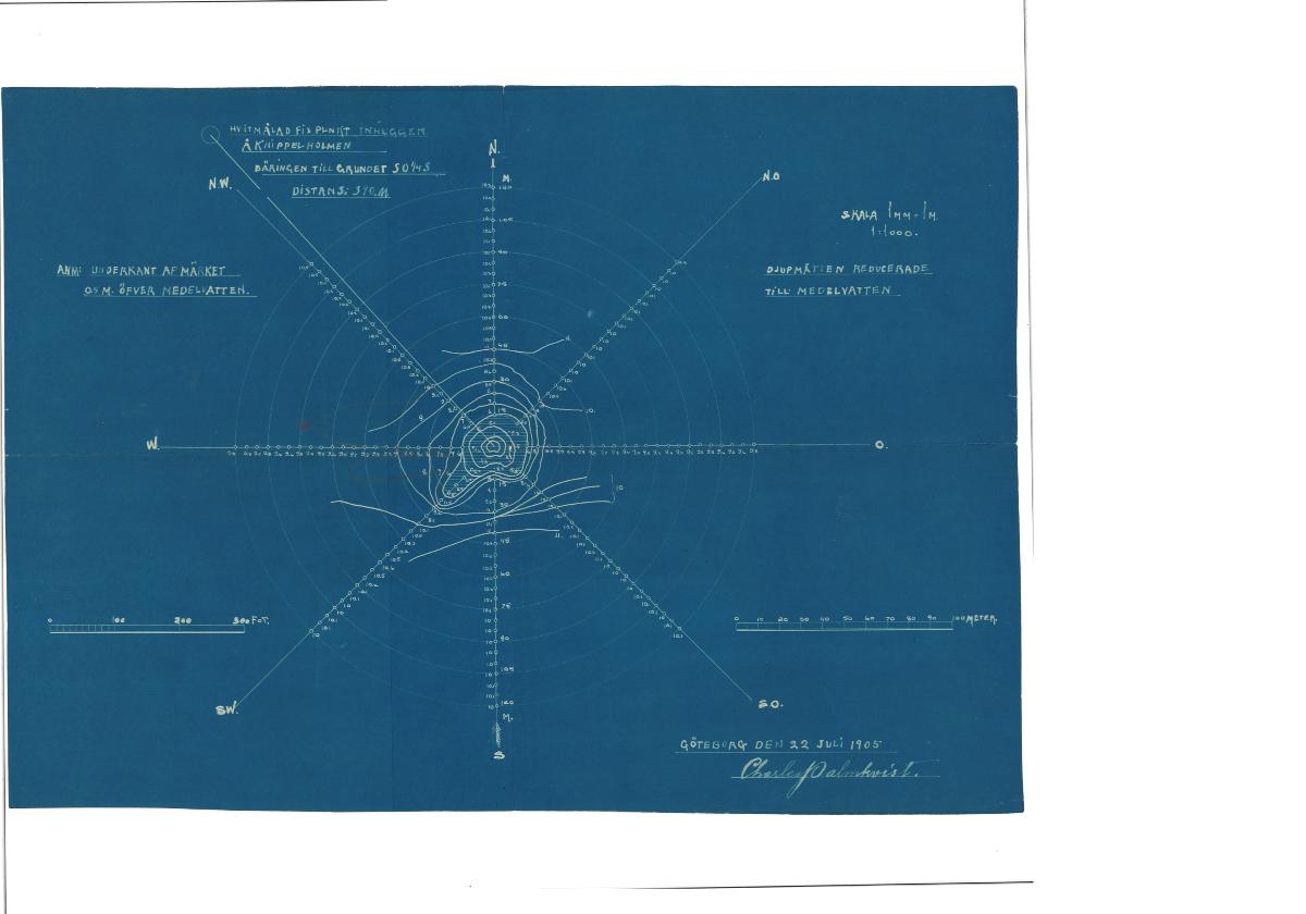 Upplodningskarta över ostindiefararen GÖTHEBORGs placering på grundet Hunnebådan. Ritad av Charles Palmkvist på uppdrag av James Keiller. Daterad 22 juli 1905.