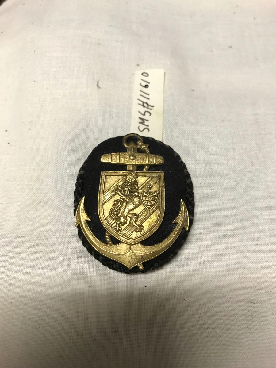 För hamnlots. Metallemblem fäst på en svart tygplatta av ylletyg. Märket består av ett ankare och på ankaret sitter en sköld med en relief av ett lejon stående på bakbenen, i händerna håller lejonet ett svärd och en sköld med riksvaptet tre kronor.