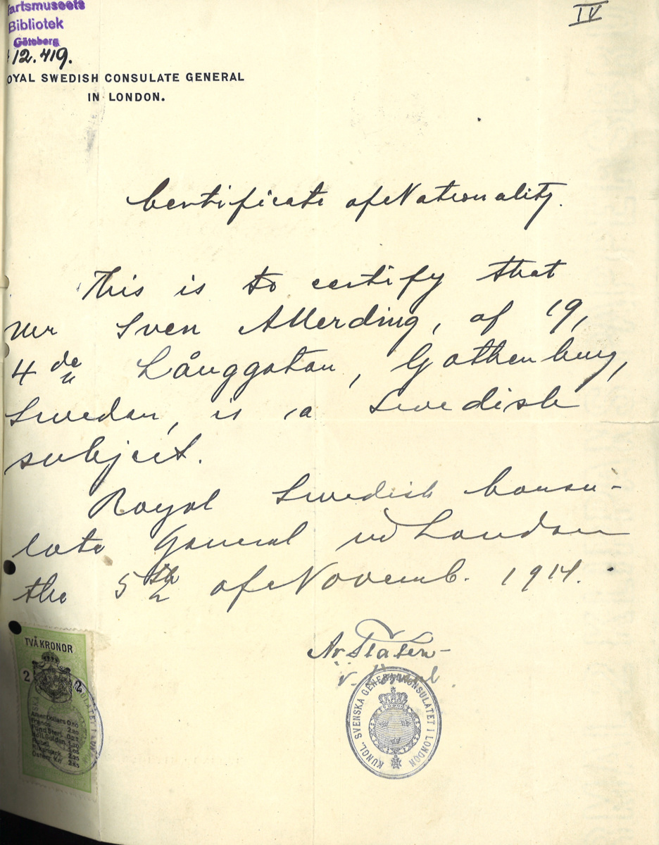 Intyg från Svenska Generalkonsulatet i London som intygar att Sven Allerding är svensk medborgare. Daterat 5 november 1914
