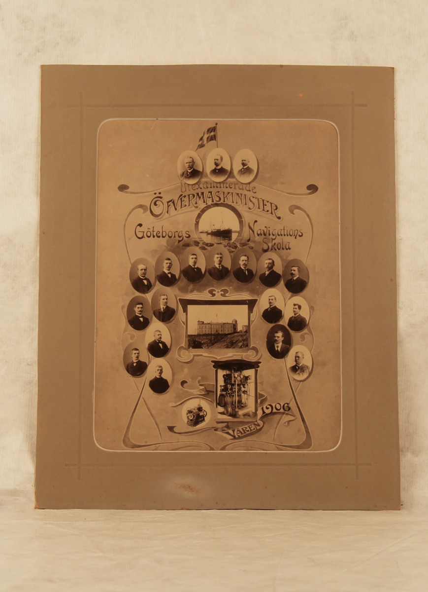 Tryck som föreställer utexaminerade maskinister från Göteborgs Navigationsskola, våren 1906, tillsammans med tre lärare. En av de examinerade är Josef Hallström.