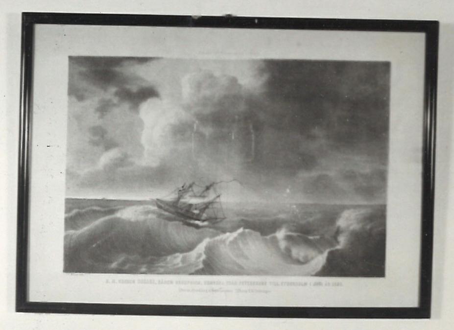 Färgtryck föreställande H. M. Konung Oscars, såsom kronprins, hemresa från Petersburg till Sthlm i juni år 1830. Efter en oljemålning.