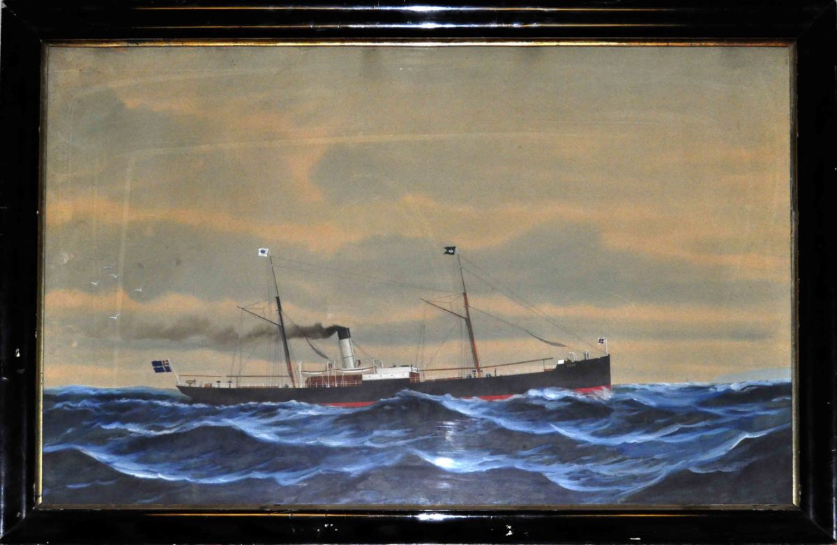 Ett mycket traditionellt fartygsporträtt, utfört under 1890-talet. Här avbildas ett modernt ångfartyg. I aktern ses unionsflaggan och toppmasten Rederi AB Eratos flagg. Målningen är mycket enkel och standardiserad i sitt utförande och är ett beställningsuppdrag, troligen till kaptenen ombord.