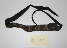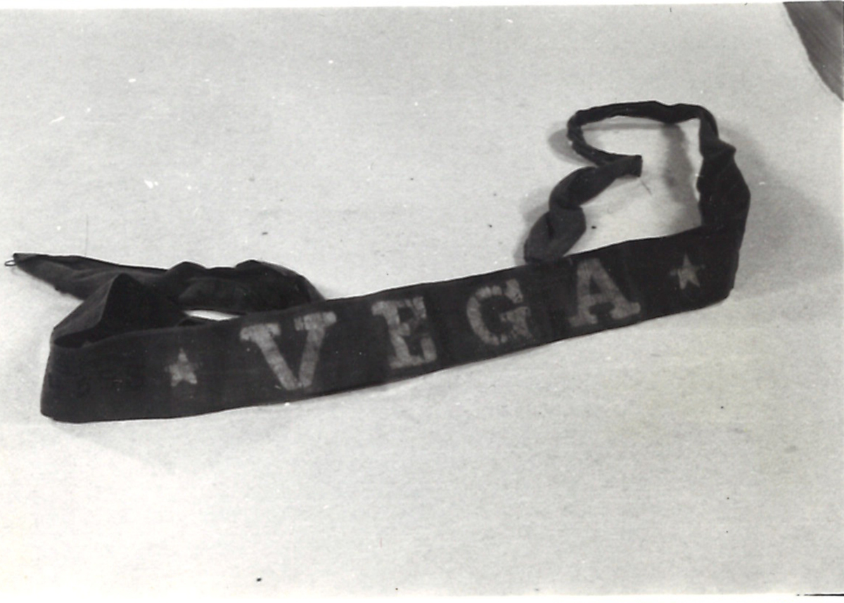 Mössband som tillhört en besättningsman ombord på S/S VEGA. Svart band med blekt rött tryck.