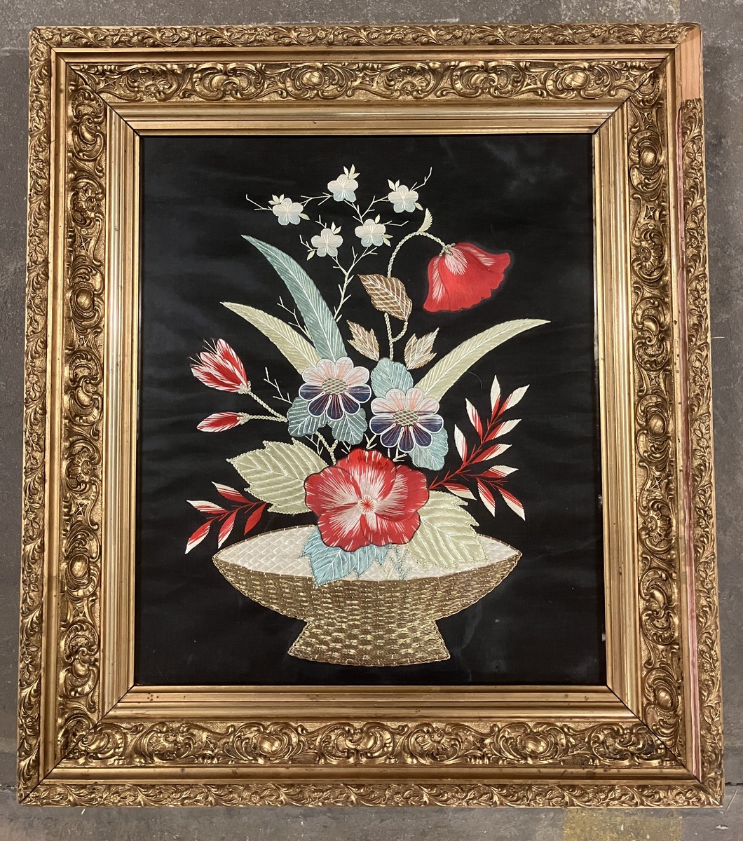 Glasad tavla med blombukett broderad med silke och guldtråd på svart botten. Monterad i guldram.