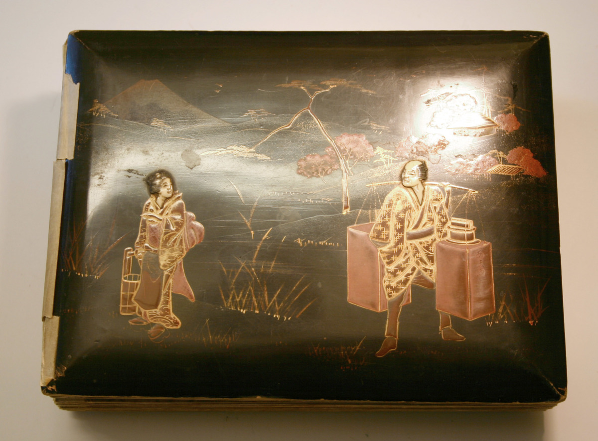 Fotografialbum med utsnidade pärmar av lackat trä. Framsidan föreställer en lantligscen med en kvinna och en man som möts på en väg nedanför berget Fudji. Albumet är av dragsspelsmodell med handkolorerade svartvita fotografier från Japan.