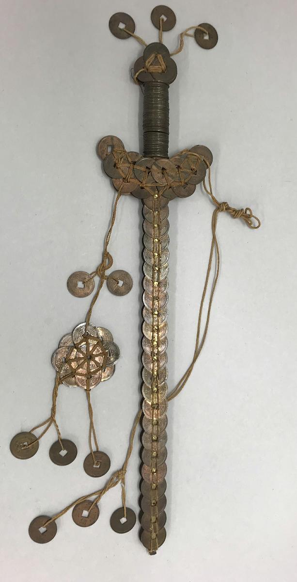 Kinesiska mynt sammanbundna med snöre i form av ett svärd. Från greppet hänger några knippen med sammanbundna mynt varav ett har formen av en blomma.