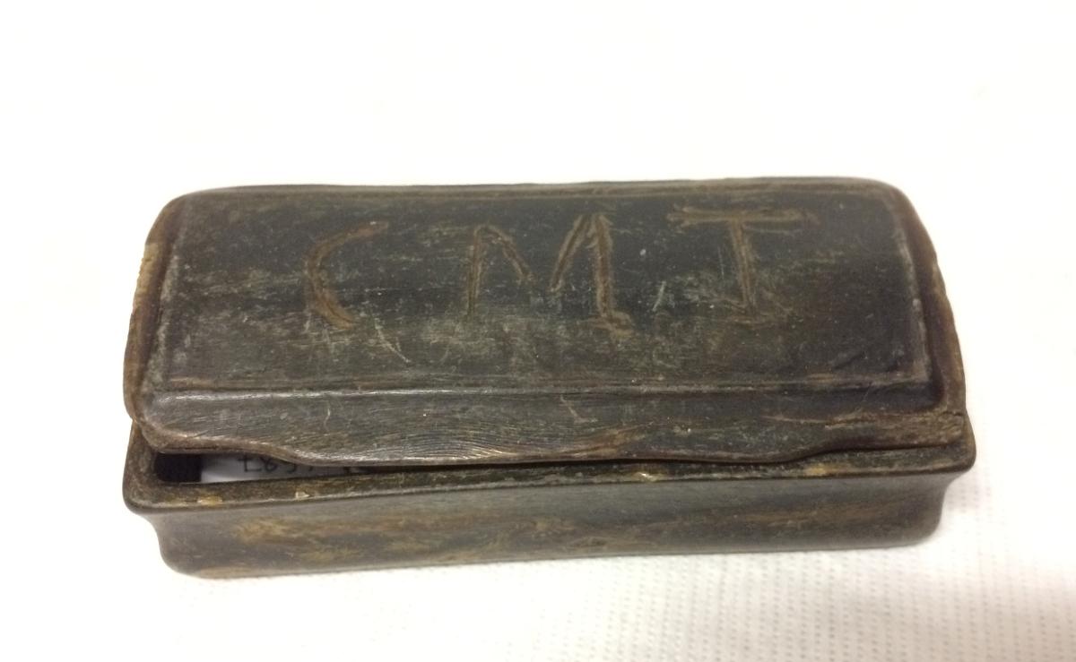 Liten rektangulär snusdosa i trä. Har tillhört sjökapten C M Tode.