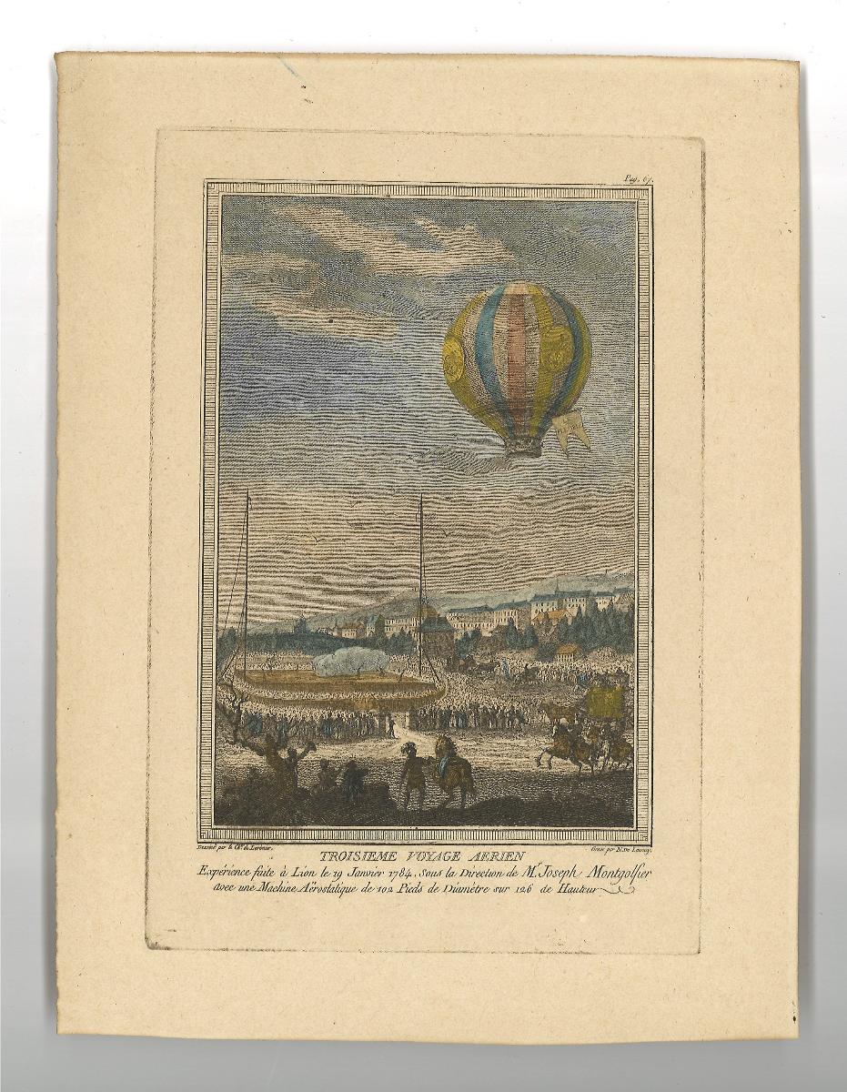 Färglagd gravyr visande tredje försöksuppstigningen med en aerostatisk maskin i Lyon 19 januari 1784, under ledning av Joseph Montgolfier. Text på franska.