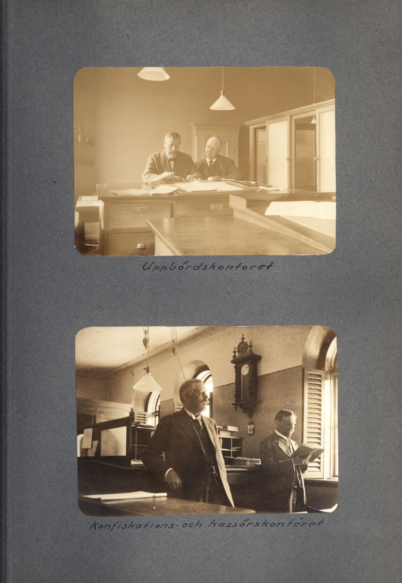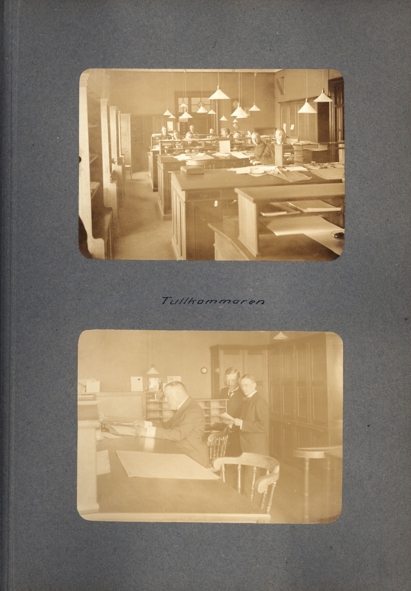 Fotoalbum innehållande svartvita fotografier från tullen i Göteborg. Fotografierna är tagna omkring sekelskiftet 1900. De visar personal från tullen, olika delar av verksamheten samt tullbyggnader, inklusive stora Tullhuset, tullhuset vid Masthuggskajen och tullhuset vid Stigbergskajen
