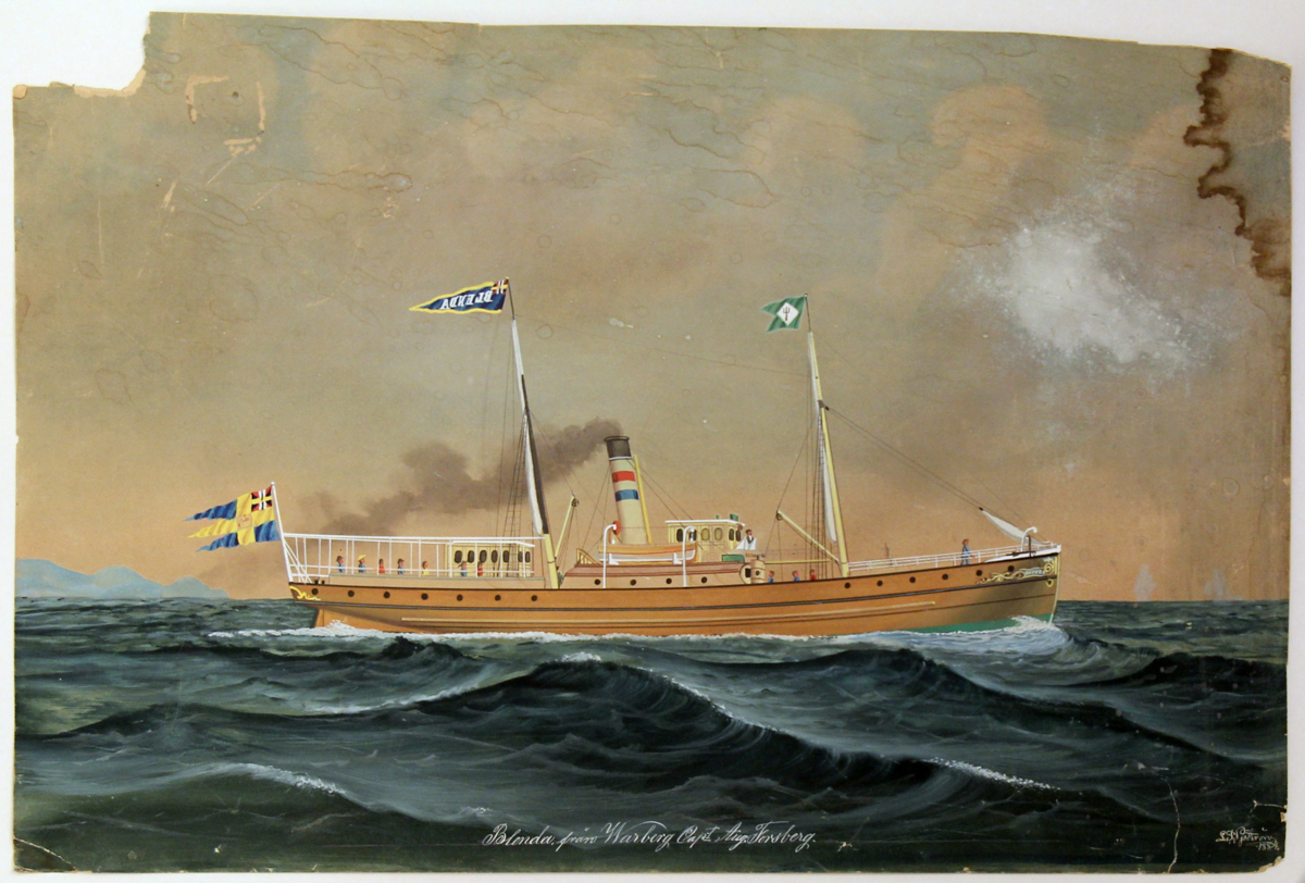 Grått skrov, unionsflagg, namnvimpel, bolagsflagg. Förd av Kapten Forsberg.