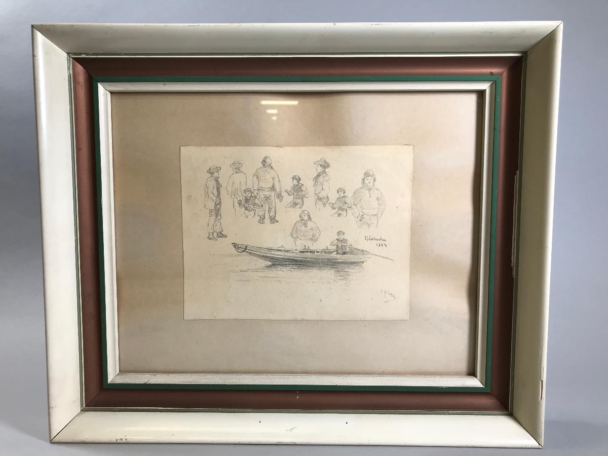 Originalskiss föreställande 10 personer och en eka.