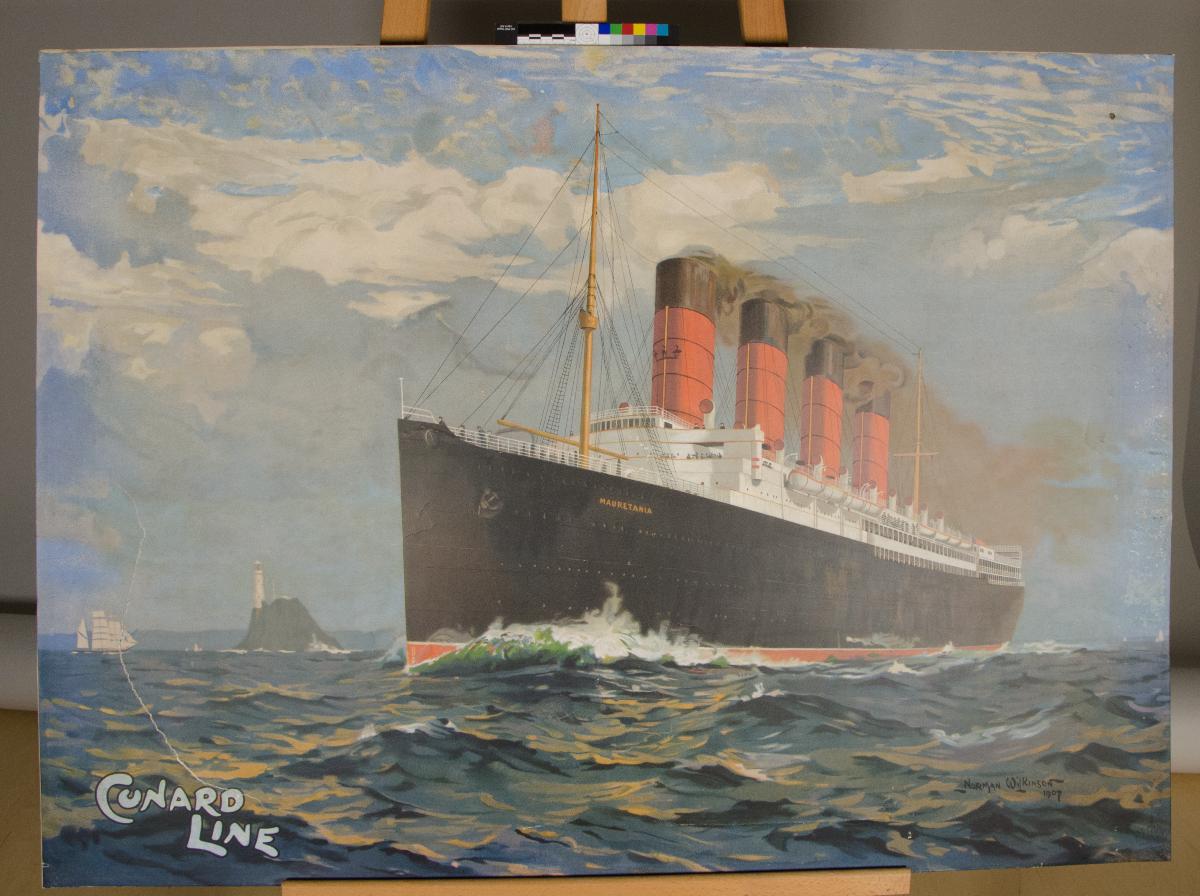 Reklamaffisch från Cunard Line förstärkt med bomullsduk.