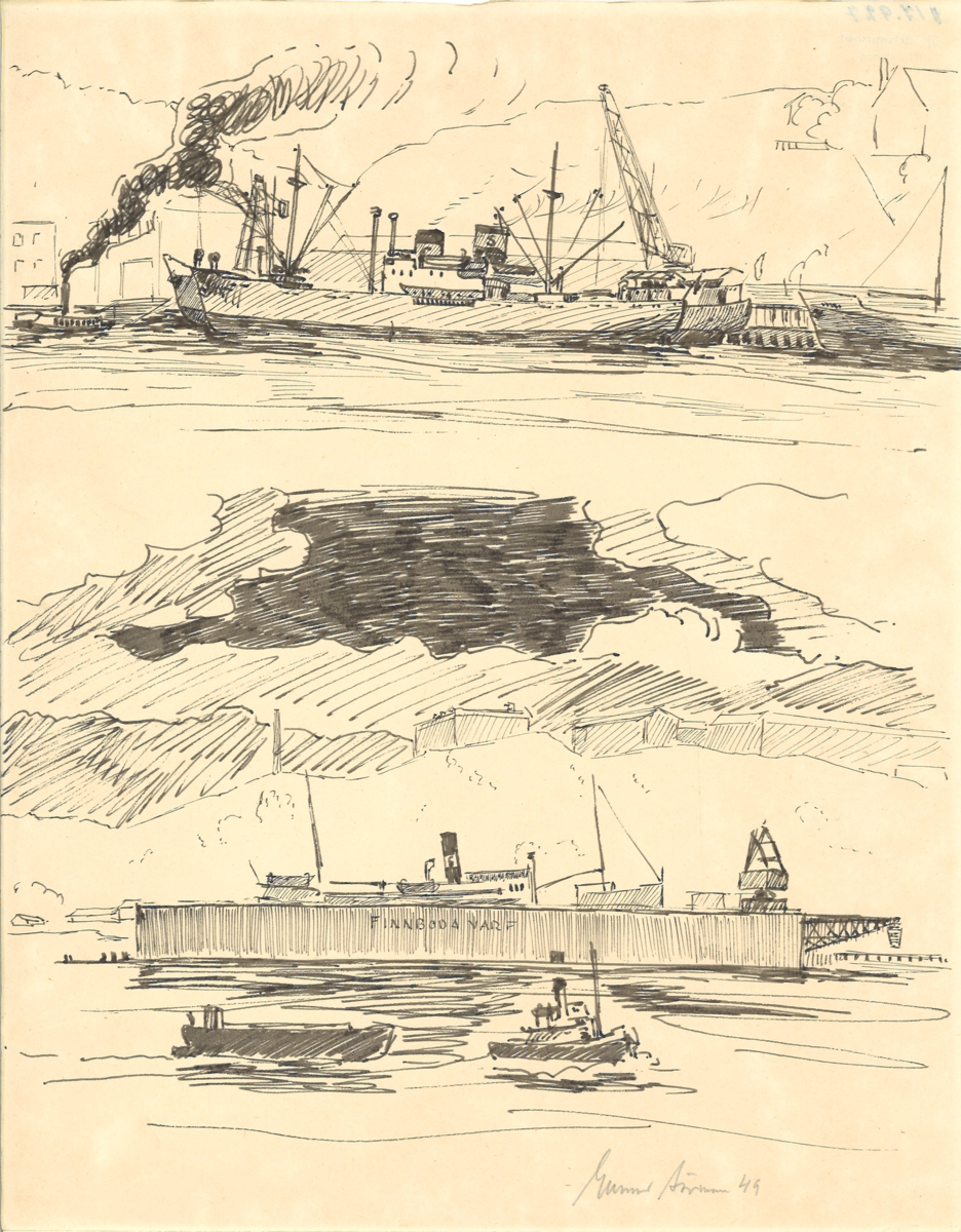 Tuschteckning, fartyg och Finnboda flytdocka i Stockholms Hamn
