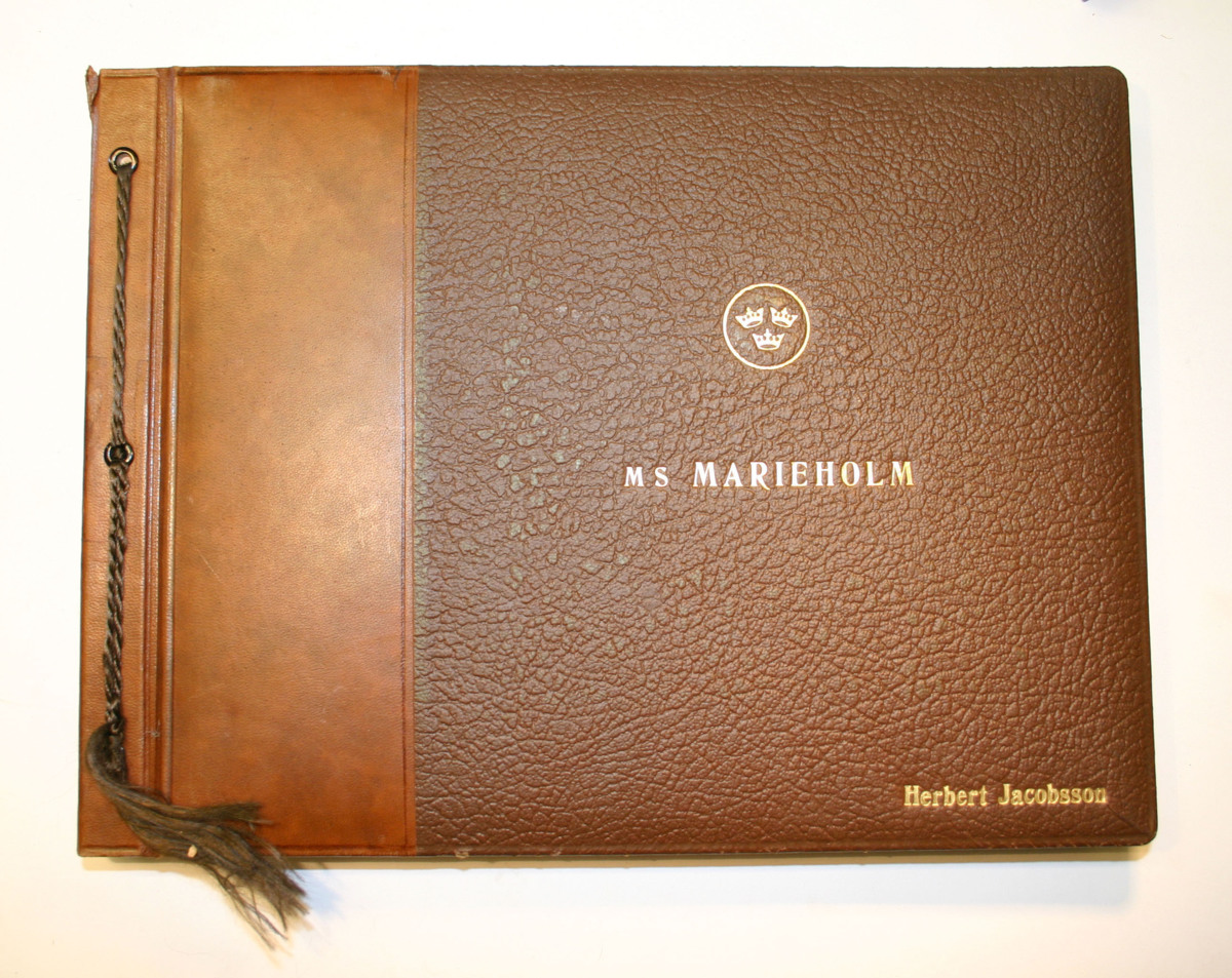 Fotografialbum med svartvita fotografier från m/s MARIEHOLM under provturen 1947, både interiör- och exteriörbilder.