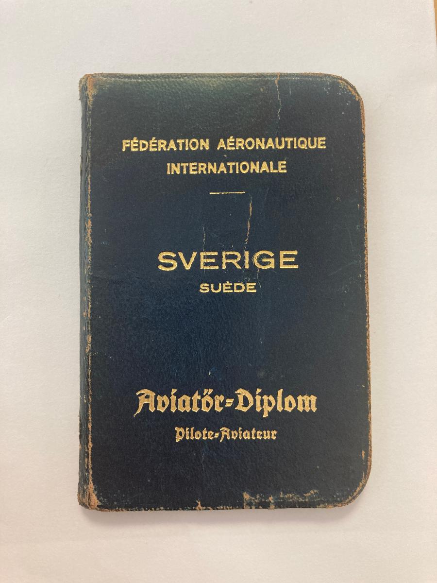 Flygkapten Ernst Rolls trafikförarcertifikat från år 1921, använt 1921-1923. Innehåller även fotografi på Ernst Roll.