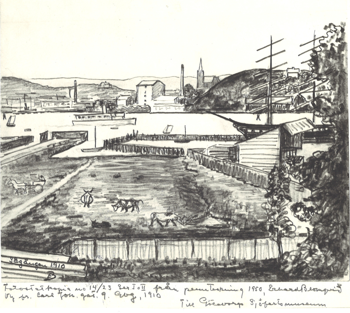 Fotostatopia av pennteckning. Teckningen är en vy från Karl Johansgatan 9 i Göteborg över Gamla Varvet och Hisingen år 1910. Teckningen målad av Erhard Blomqvist år 1950.