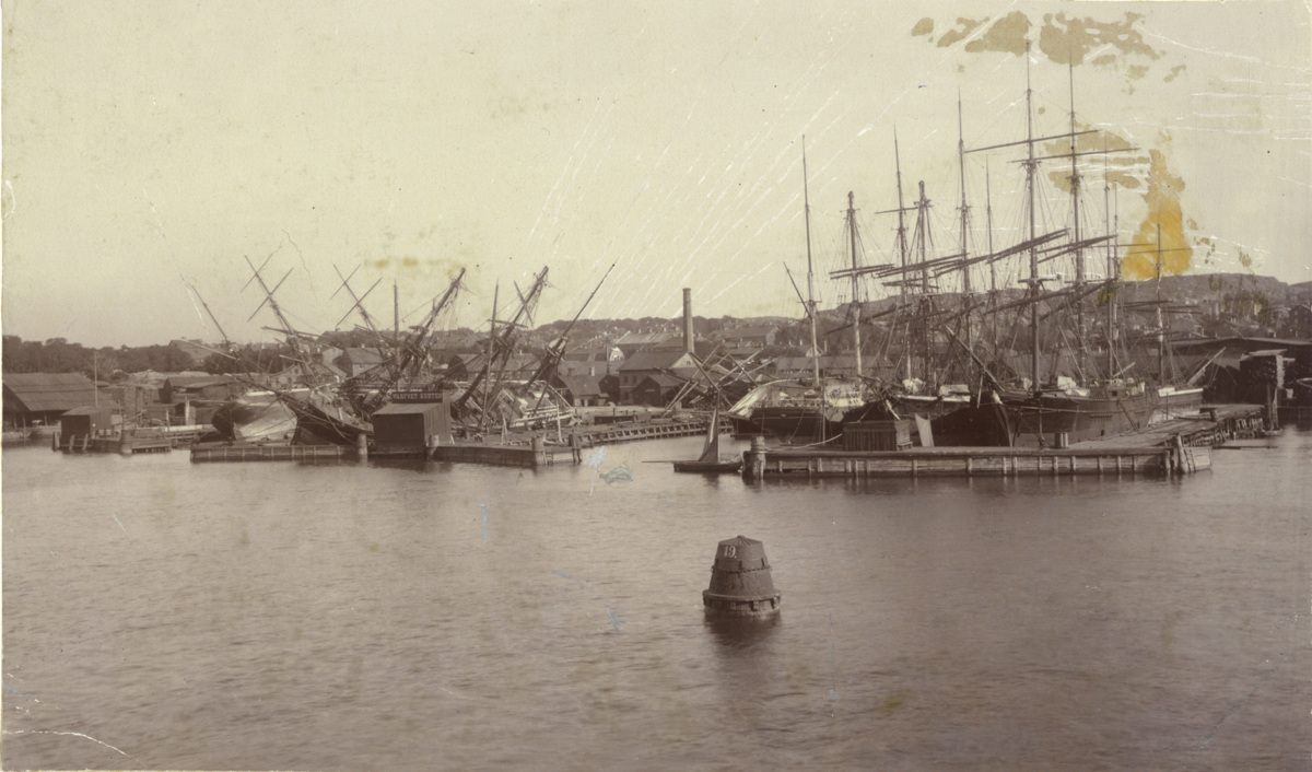 Fotografiet taget i september 1890. Det visar flera segelfartyg vid Kustens varv, några är kölhalade.