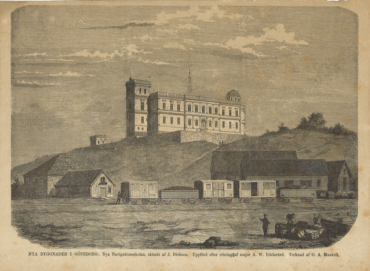 Tidningsurklipp av litografi föreställande nya navigationsskolan i Göteborg. Tidigare inramat.