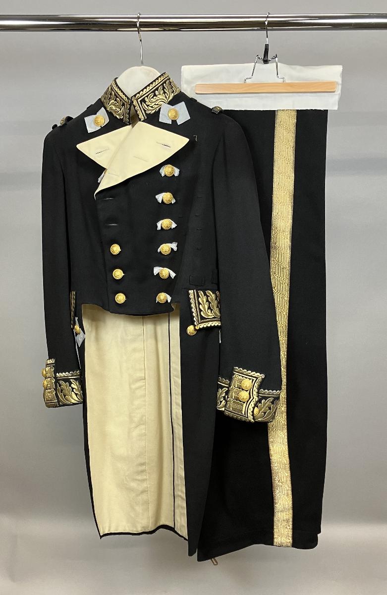 Uniformen består av amiralsfrack, guldgaloner, byxor, hatt, epåletter sabelkoppel och svensksundskärp. Epåtterna har tillhört amiral Wilhelm Dyrssen men överläts genom testamente till amiral C.l. Lindström.