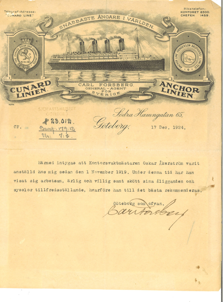 Annons för emigrantagent Carl Forsberg, Södra Hamngatan 65, som agent för emigrationsrederierna Cunard Line och Anchor Line.
