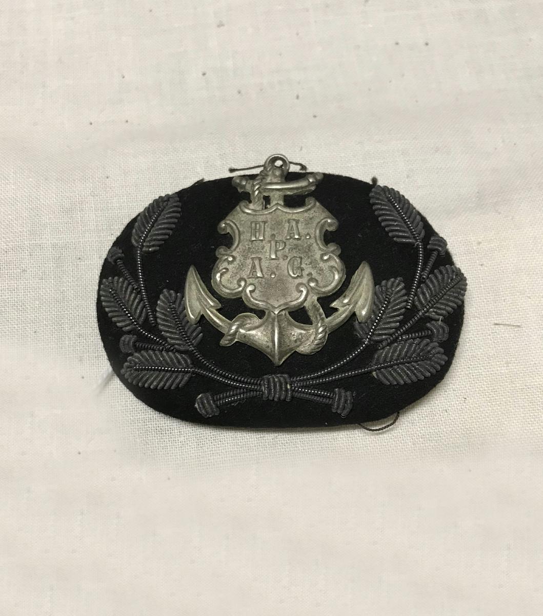 Tygemblem för HAPAG-linjen i svart ylletyg med metallbrodyr föreställande en lagerkrans. Emblemet är försedd med en mässingsplatta föreställande ett ankare och en vapensköld med bokstäverna H. A. P. A. G.
