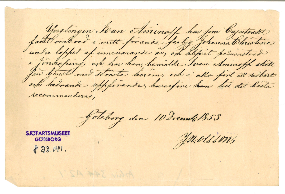 Gå tillbaka till sökPublic DomainLägg till i Min samlingKopiera länkSkriv utTjänstgöringsbetyg för arbete ombord JOHANNA CHRISTINAAktörerIvan Fredrik Aminoff (1838 - 1905), Brukare Hans Stephan Aminoff, BrukareKategoribetyg (Dokument, handlingar, personliga handlingar)Datering1853GeografiGöteborg (Europa, Sverige, Västergötland, Västra Götalands, Göteborg) Jönköping (Europa, Sverige, Småland, Jönköpings, Jönköping)Material och teknikpapper, handksriftDimensionerGrundmått 14,00 x 22,00 cmInventarienummerSMG23141UtställdInte utställd på museet