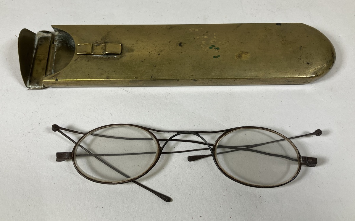 Hopfällbara glasögon i mässingsfodral.