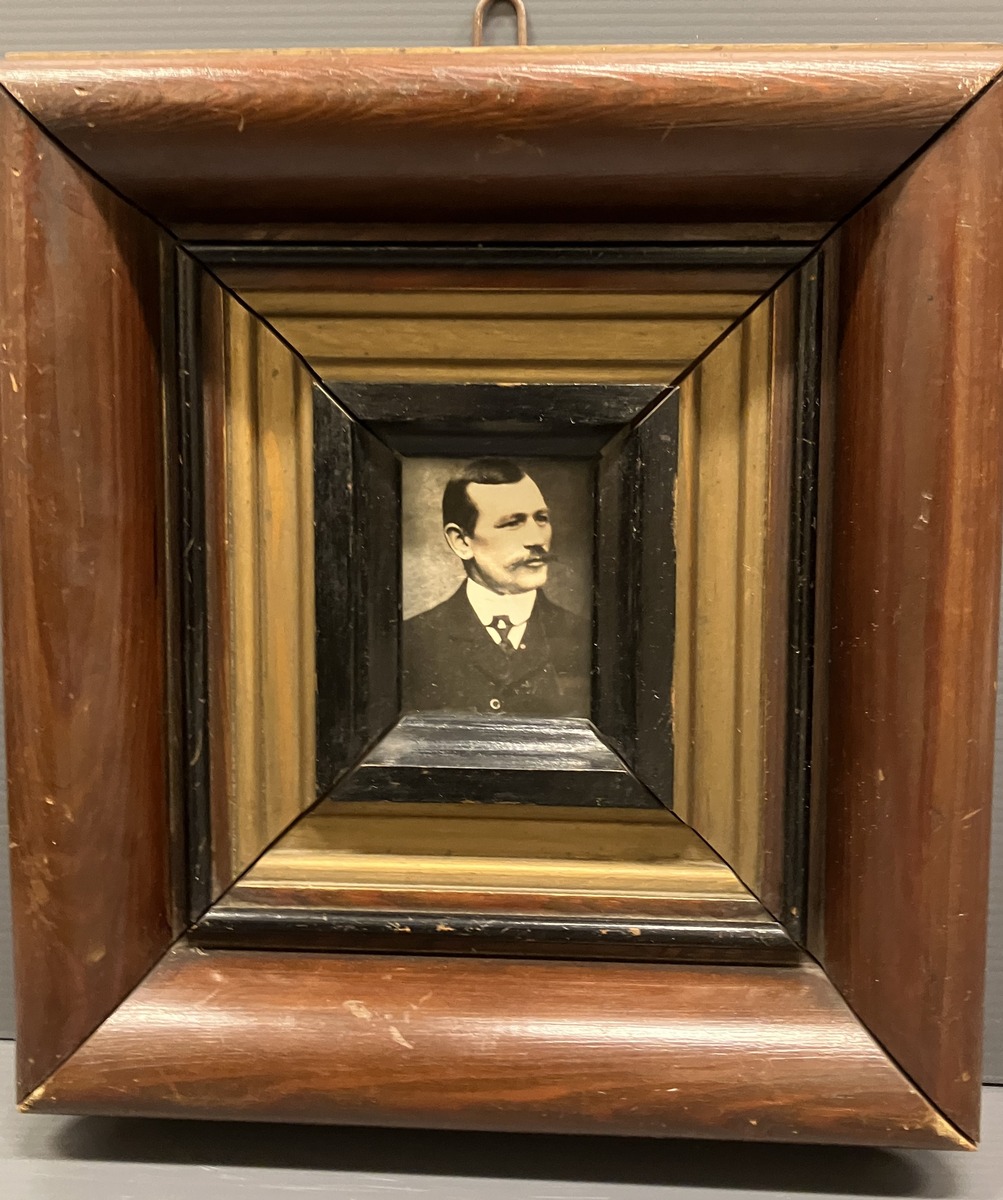 Brun med förgyllda inlägg. Ramen har tidigare hängt i kapten Lindbergs hem, Vegagatan 8, Göteborg.