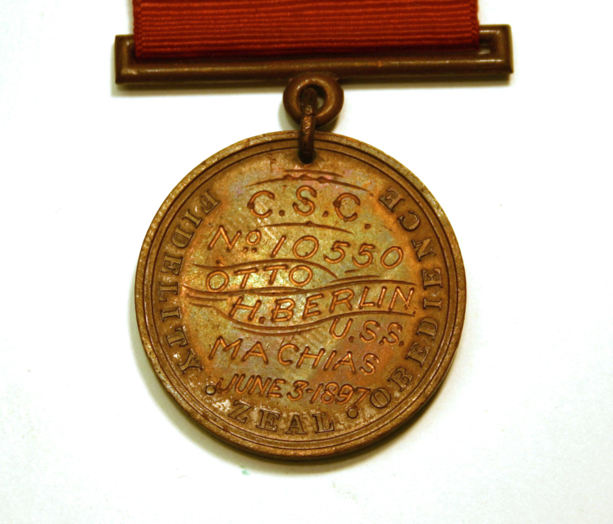 Koppar medalj med rött medaljband i siden. Amerikanska flottans medalj för plikttrogenhet, tjänstenit och lydnad. Tilldelad B. å U.S.S. Machias 3/6 1897.