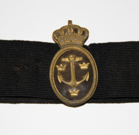 Mössband i svart till en skärmmössa. På bandet finns ett ovaltmössmärke i svart och mässingsmetall förreställande ett ankare och tre kronor, märket är krönt med en kungakrona.