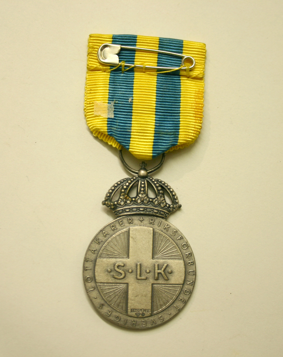 Silvermedalj i blått och gullt band. Förvaras i en etui i blått skinn och mässingsspänne, SLK i guldbokstäver på locken. Medaljen är tilldelad fru Signe Berlin av Riksförbundet Sveriges Lottakårer.