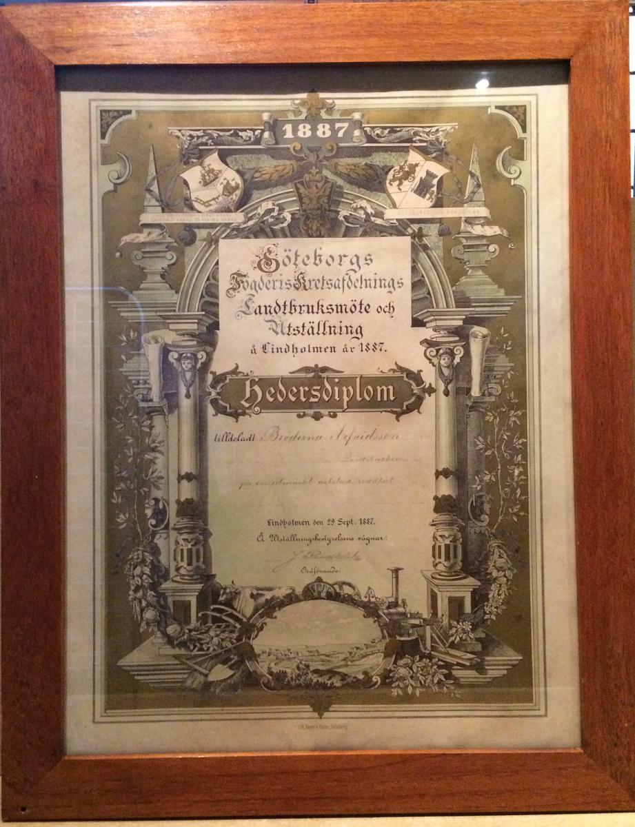 På diplomet står: 'Göteborgs Fögderis Kretsafdelnings Landtbruksmöte och Utställning å Lindholmen år 1887. Hedersdiplom tilldelat Bröderna Arfvidsson, Qvillebäcken, för en utmärkt arbetad roddbåt'.