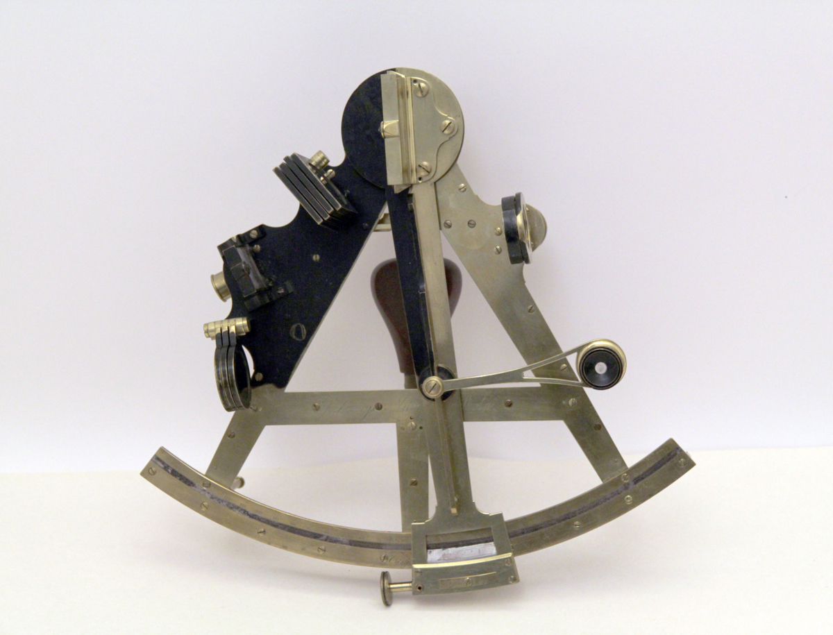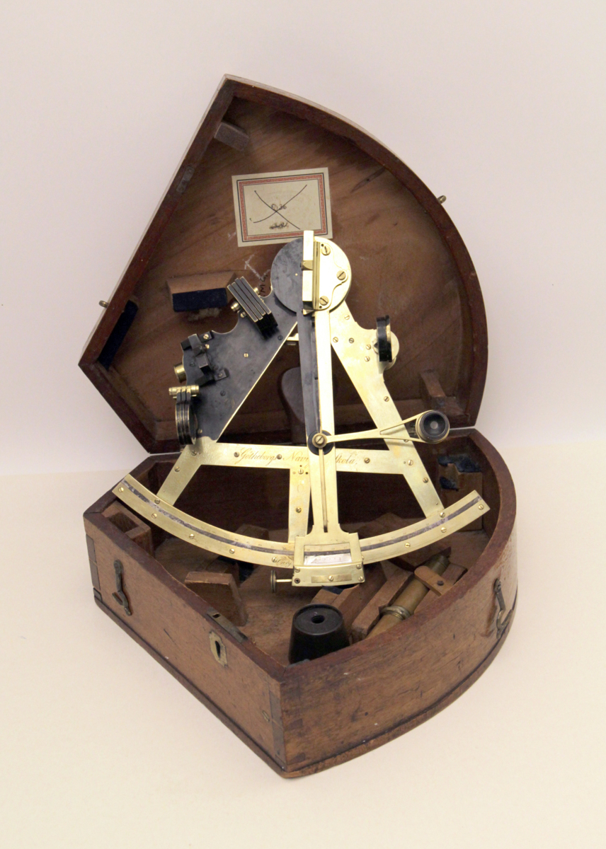 Sextant bestående av mässingsram, trekantsformad. Handtag av fernissat trä undertill. Nonien skala av silver med graderad skala 0-135. Löpande arm med skruvtving. På armen en mindre arm med lupp för att avläsa skalan. På sidan en tubhållare för att placera teleskop. Horisontspegel, spegel och skymglas i två grupper, tre i ena och fyra i andra. Trekantsformad låda i mahogny med sinkade hörn,Haspar och låsbricka i mässing, nyckel saknas. Insidan har hållare för två medföljande sikten. Gravyr på nonien "Cary London", Gravyr på mittarmen Götheborgs Navig: Skola.