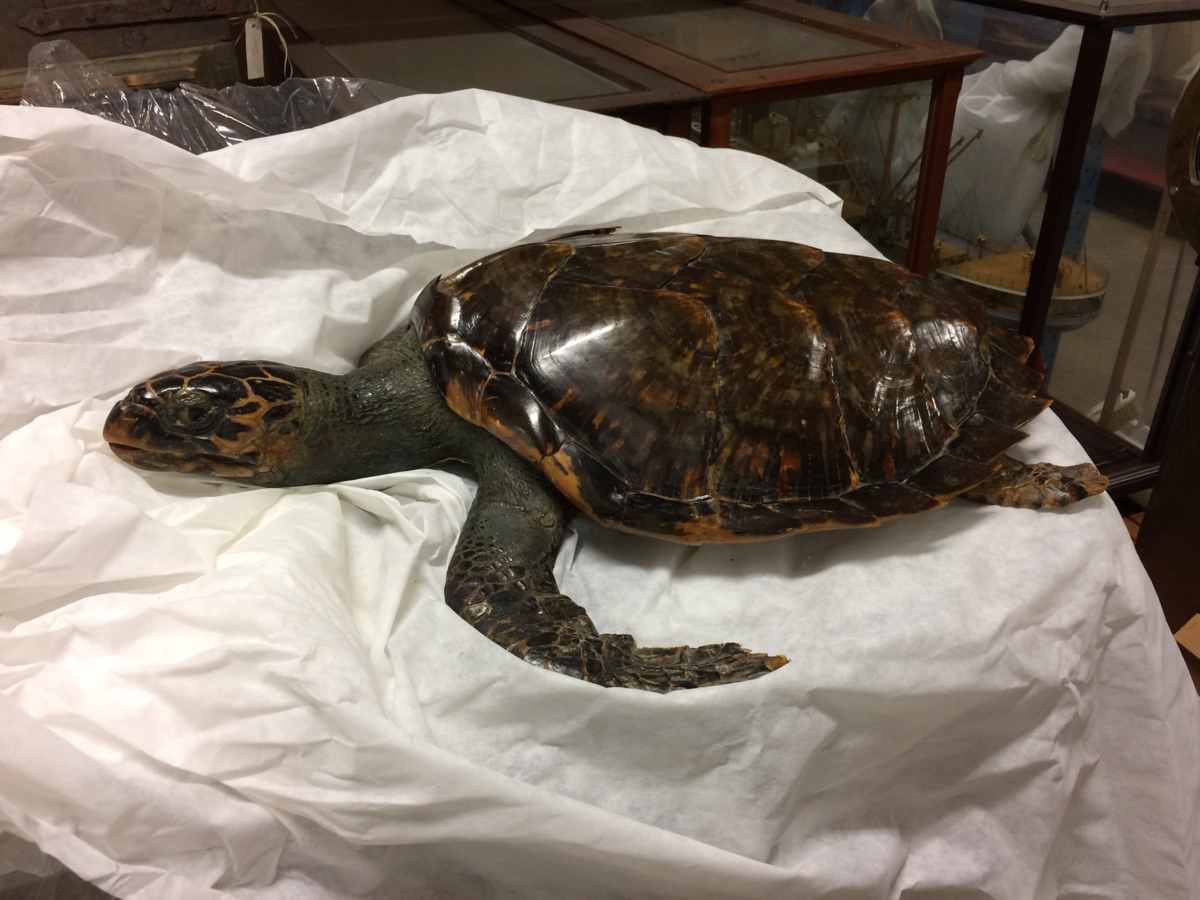 Uppstoppad Karettsköldpadda, ( Eretmochelys imbricata), sjömansminne från Havanna, Cuba. Brunspräcklig sköld, huvud och hals bemålad med grön färg.