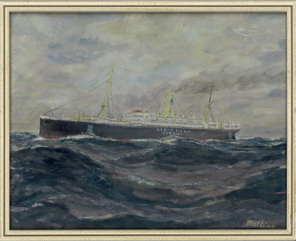 Inramad akvarellmålning föreställande ångfartyget STOCKHOLM till havs. Fartyget är avbildad från babord sida. Skrovet är målat i svart med de svenka neutralitetsfärgerna i blått och gult. Från den gula skorstenen med företagsloggan, en blå cirkel med tre gula kronor, ryker sotröken från ångmaskinen.