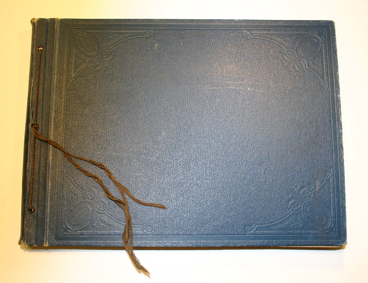 Album i blått konstläder innehållande svartvita fotografier över skeppsgossebriggarna.
