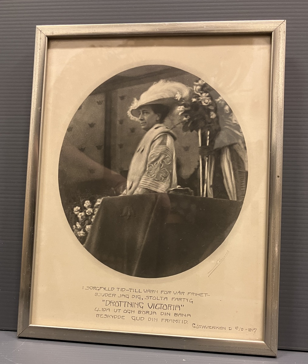 Påskrift: I sorgfylld tid - till värn för vår frihet - bjuder jag dig, stolta fartyg DROTTNING VICTORIA glida ut och börja din bana beskydde Gud din framtid. Götaverken D. 13/9-1917