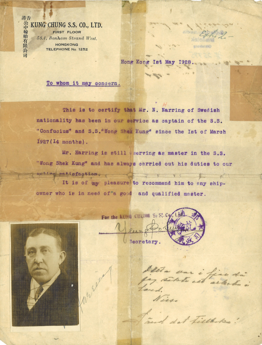 Tjänstgöringsbetyg för sjökapten Nils Harring. Utfärdat av rederi Kung Chung S.S. Co. Ltd. i Hong Kong 1 maj 1928. Text på engelska. På betyget sitter ett personfotografi av Nils Harring fastklistrat.