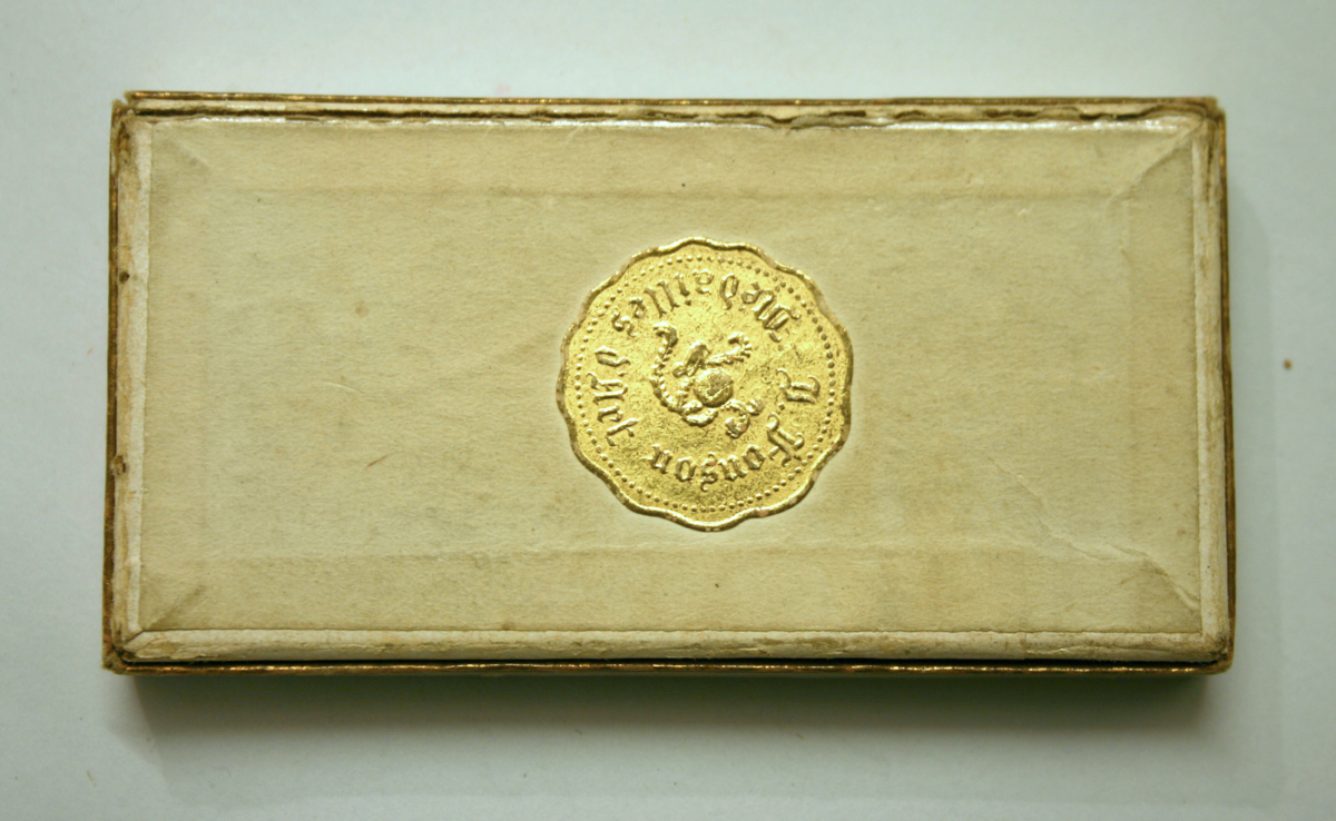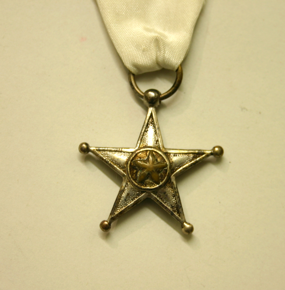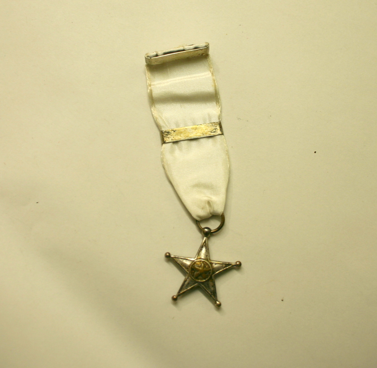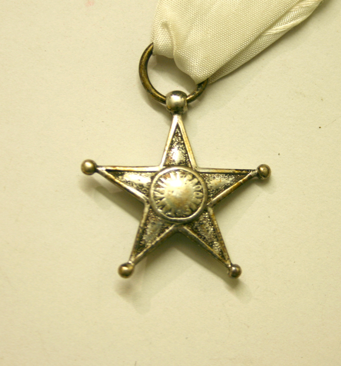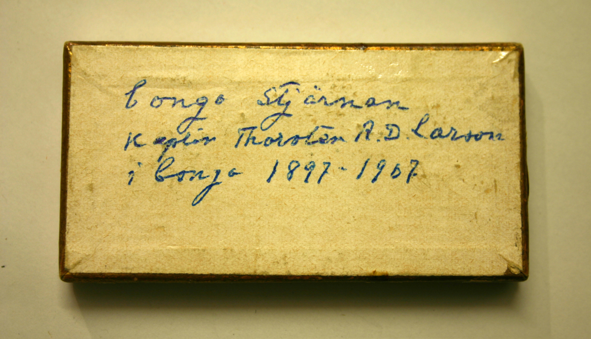 Kongostjärnan, The service star, i silver på vitt textilband att fästa på bröstet. Instiftades år 1889. Har förvarats i en vit pappask med guld dekor.