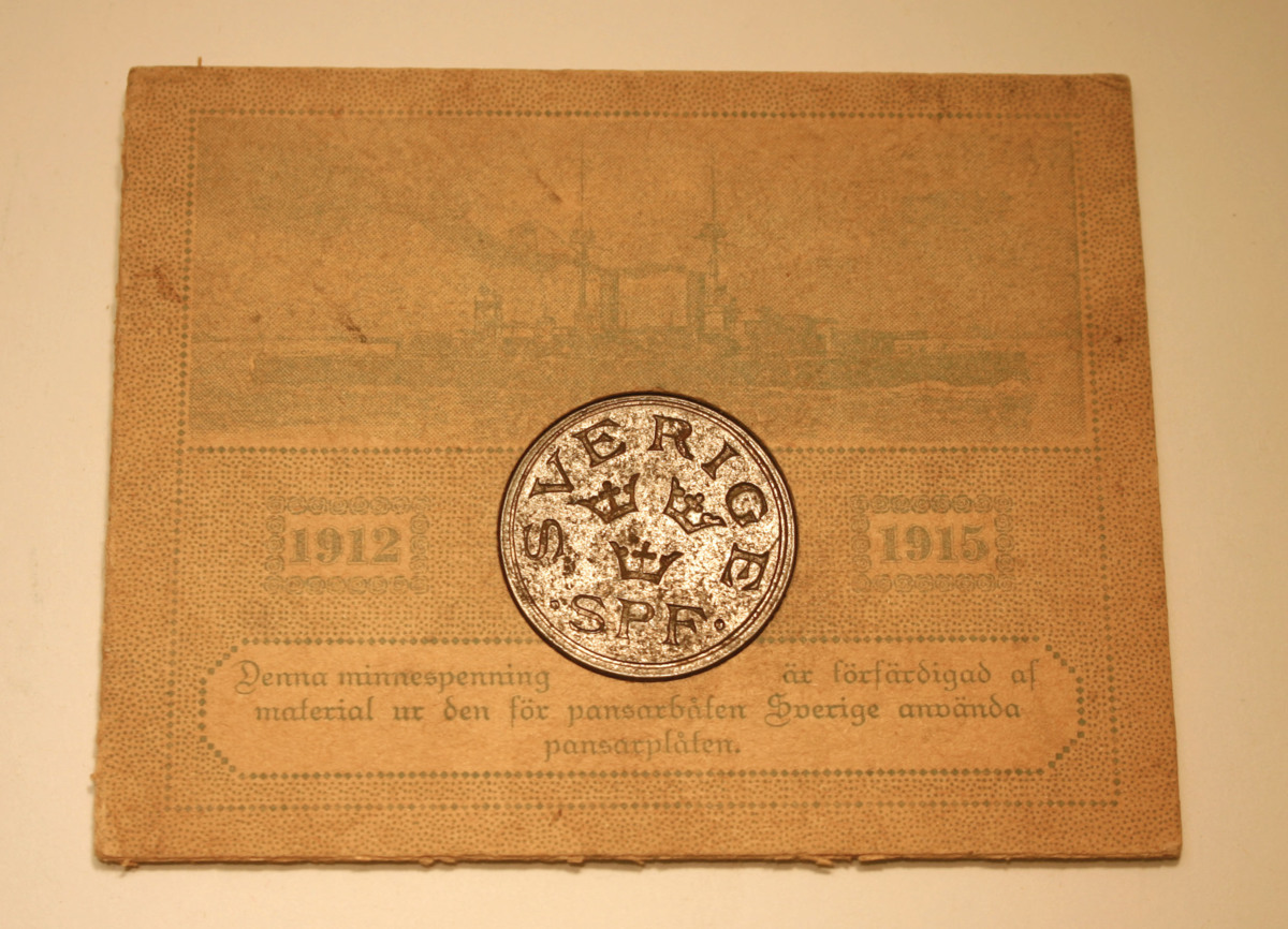 Minnespeng tillverkad av rester från pansarplåten till pansarskeppet SVERIGE. Med pappfodral. Text på pappskivan: "1912-1915. Denna minnespenning är förfärdigad af material ur för pansarbåten Sverige använda pansarplåten".