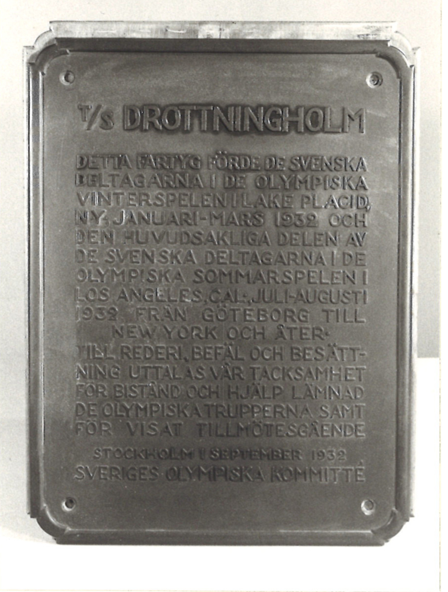 Plakett från Sveriges Olympiska Kommité 1932 som ett tack till DROTTNINGHOLM för transport och omvårdnad av den svenska olympiatruppen.