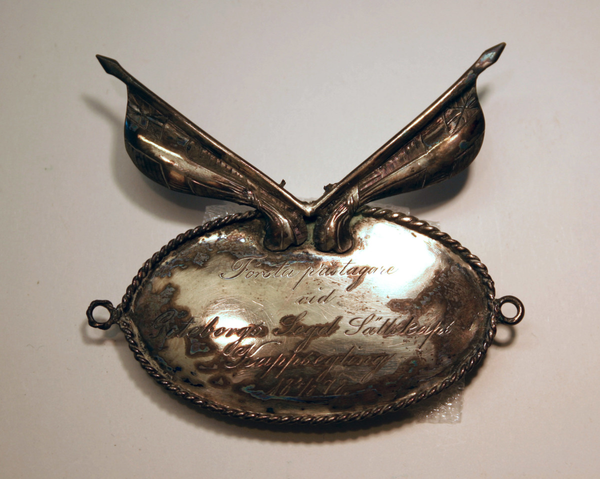Gå tillbaka till sökPublic DomainLägg till i Min samlingKopiera länkSkriv utSilverplakettAktörerGöteborgs Kungliga Segel Sällskap (GKSS) (1860 - ), Anknytning tillKategorisegelsport (Idrott) plakett (Utmärkelse)Datering1878Material och tekniksilverMärkningGravyr: Första Pristagare vid Göteborgs Segel Sällskaps Kappsegling 4/8 1878DimensionerGrundmått 6,50 x 7,00 cmInventarienummerSMG27132UtställdInte utställd på museet