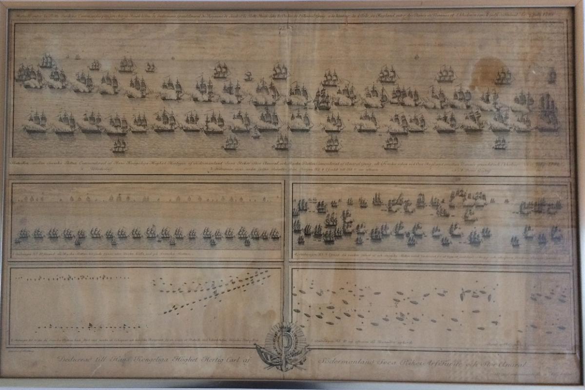 Ritad av A. Sjöstierna, Captain vid amiralitetet. Graverad av J. Gillberg. Bataillen emellan Svenska flottan kommanderad av Hertigen av Södermanland, prins Karl och ryska flottan kommanderad av amiral Grieg i Finska Viken vid ön Hogland emellan grundet och Ekholmen 17 juli 1788.