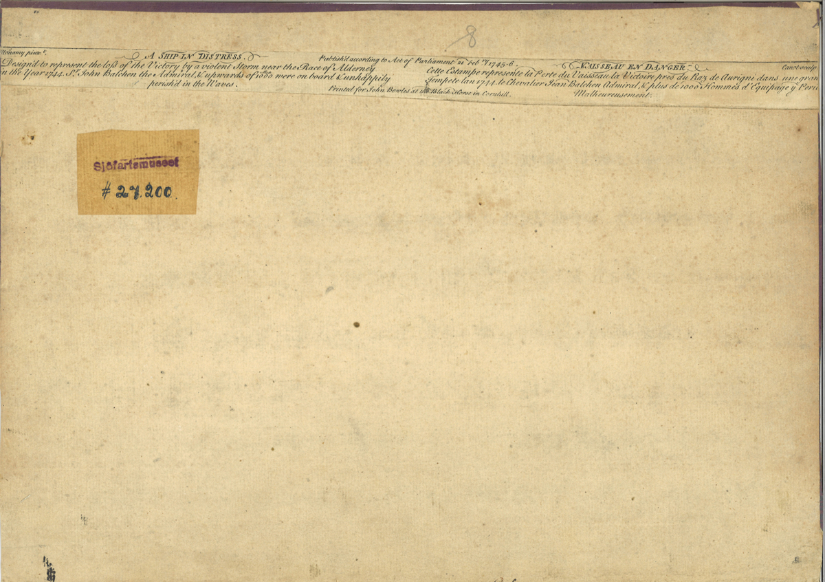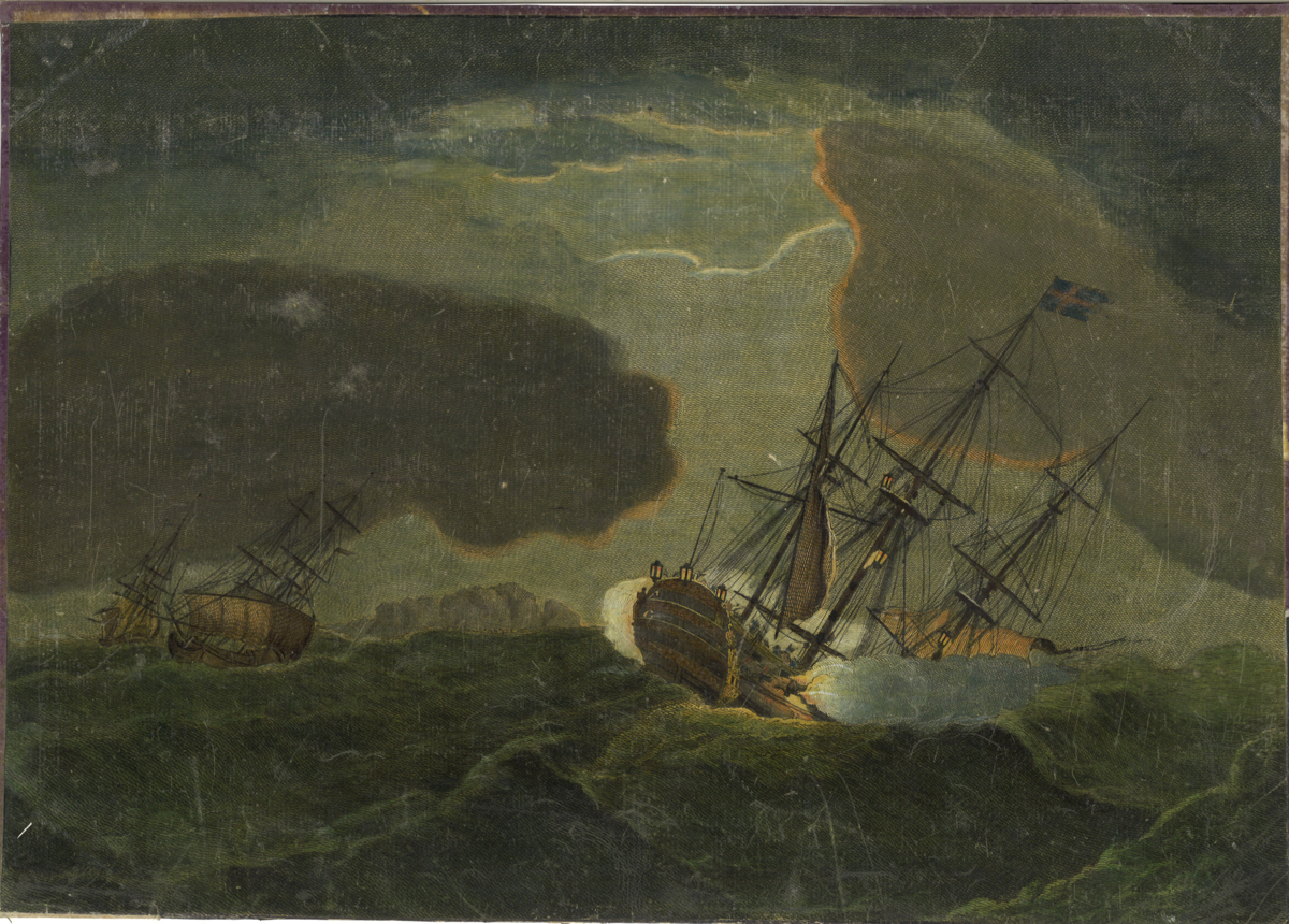 Föreställande ett fartyg som går under i storm nära the Race of Alderney. Fartygets namn var VICTORY och med detsamma gick en amiral och 1.000 man till botten.