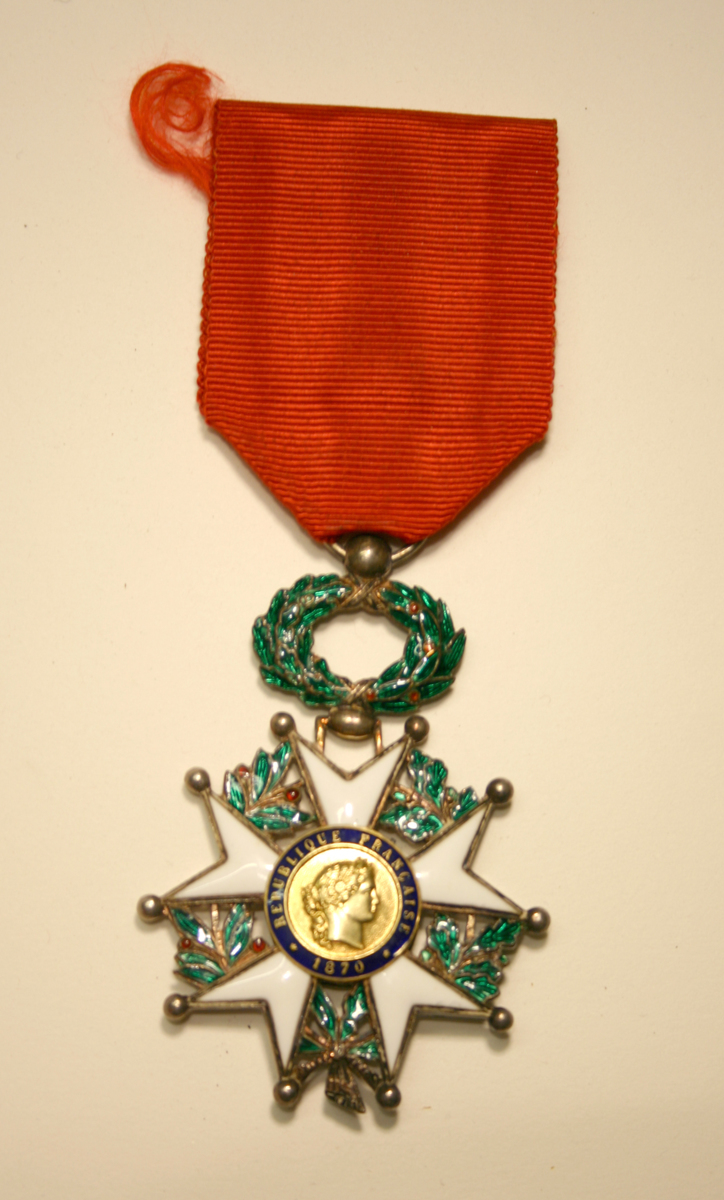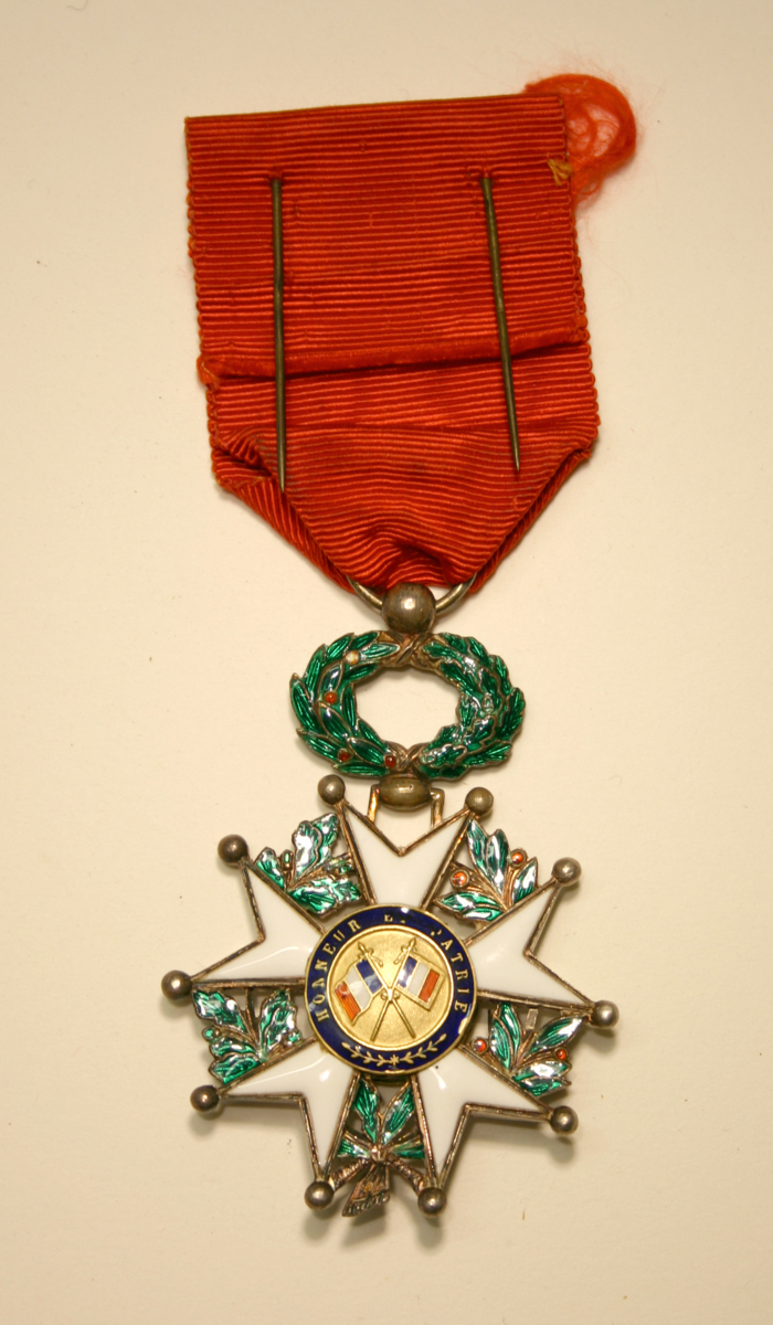 Hederslegionens kors, 'Chévalier de la Legion d'Honneur', i rött sidenband.