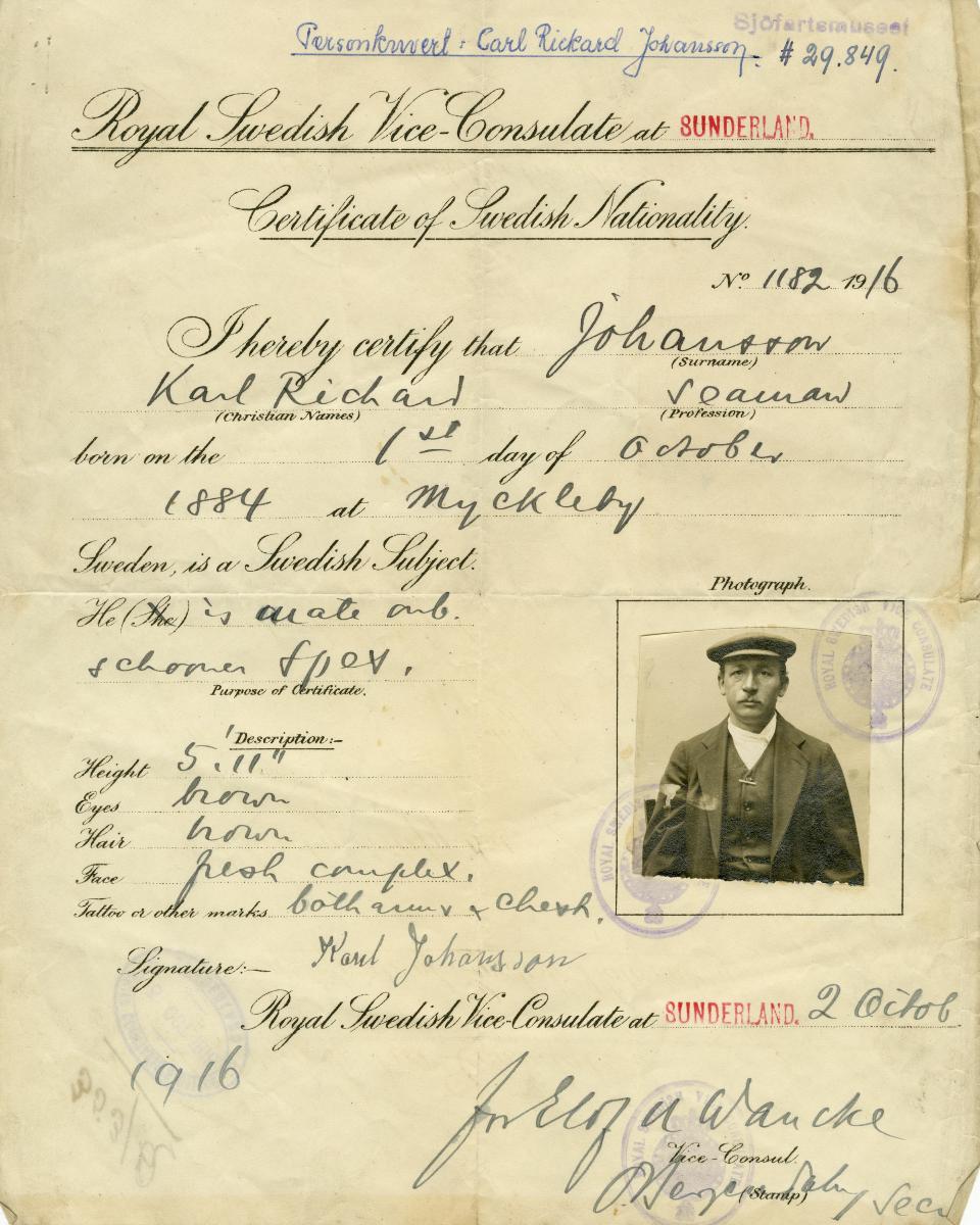 Dokument för sjöman Carl Rickard Johansson, pass/intyg om nationalitet utfärdat av svenska konsulatet i Sunderland i England 2 oktober 1916