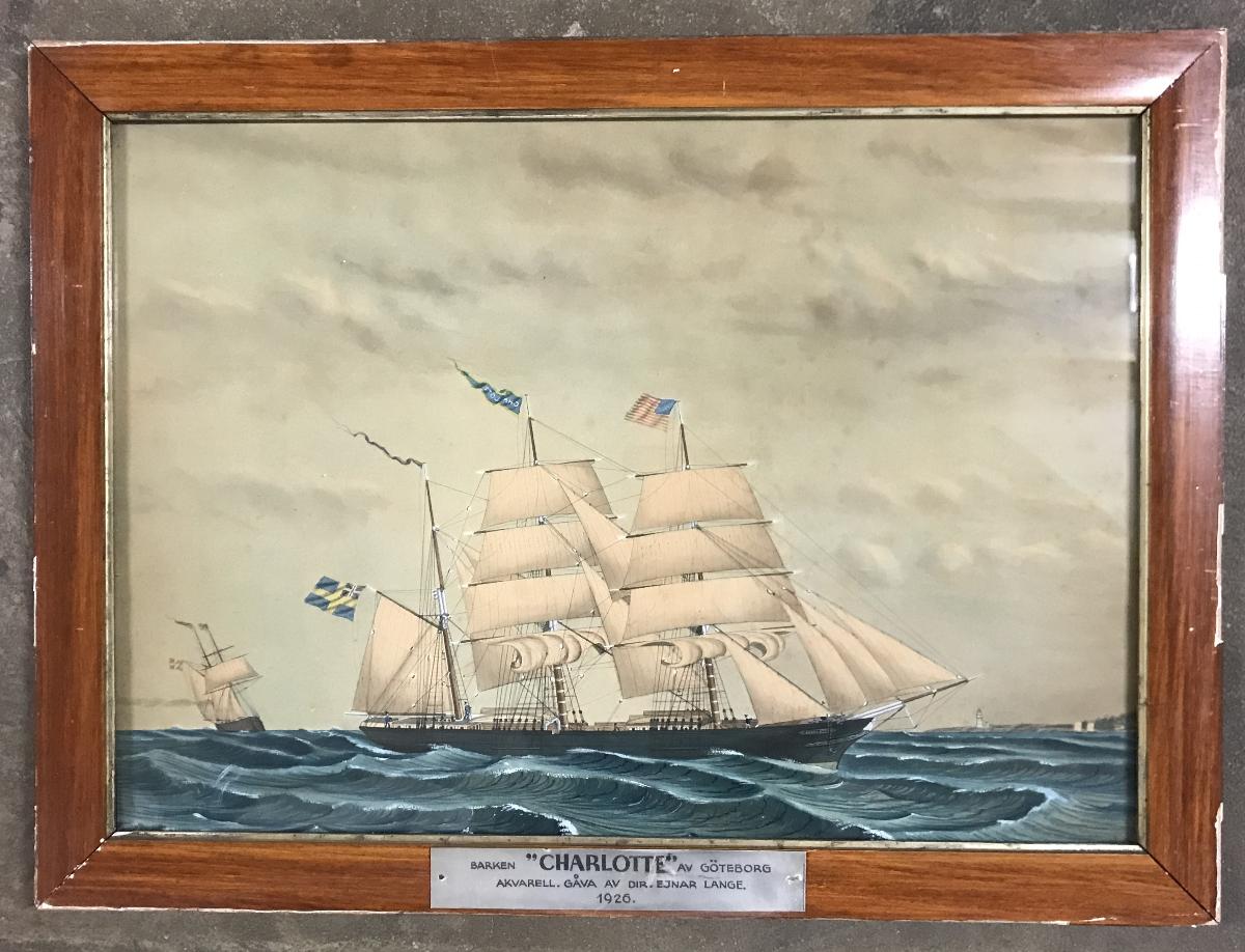 Inramad akvarell föreställande den tremastade barken CHARLOTTE, byggd 1854 i Svartvik.